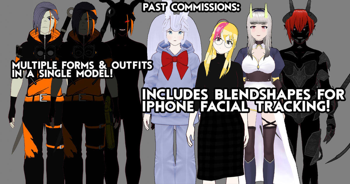 Models with blendshapes/facial tracking starting at $200 with 1/2 up-front deposit, 1/2 once finished. I can also have your model prepared for VRChat use!I'm most comfortable doing what I call "faux2D", where the model has minimal shading & has a very "anime" look - the illusion of "lack of depth". This simplistic style means assets that would generally only work well with Live2D fit the style of your model! However, I can also make a 3D model that matches your Live2D model if you already have one - so you're not limited.My models can also have alternate outfits, alternate forms, accessories (you supply them), all with new original textures - and again, all the blendshapes for iPhone tracking (iPhone X and up).